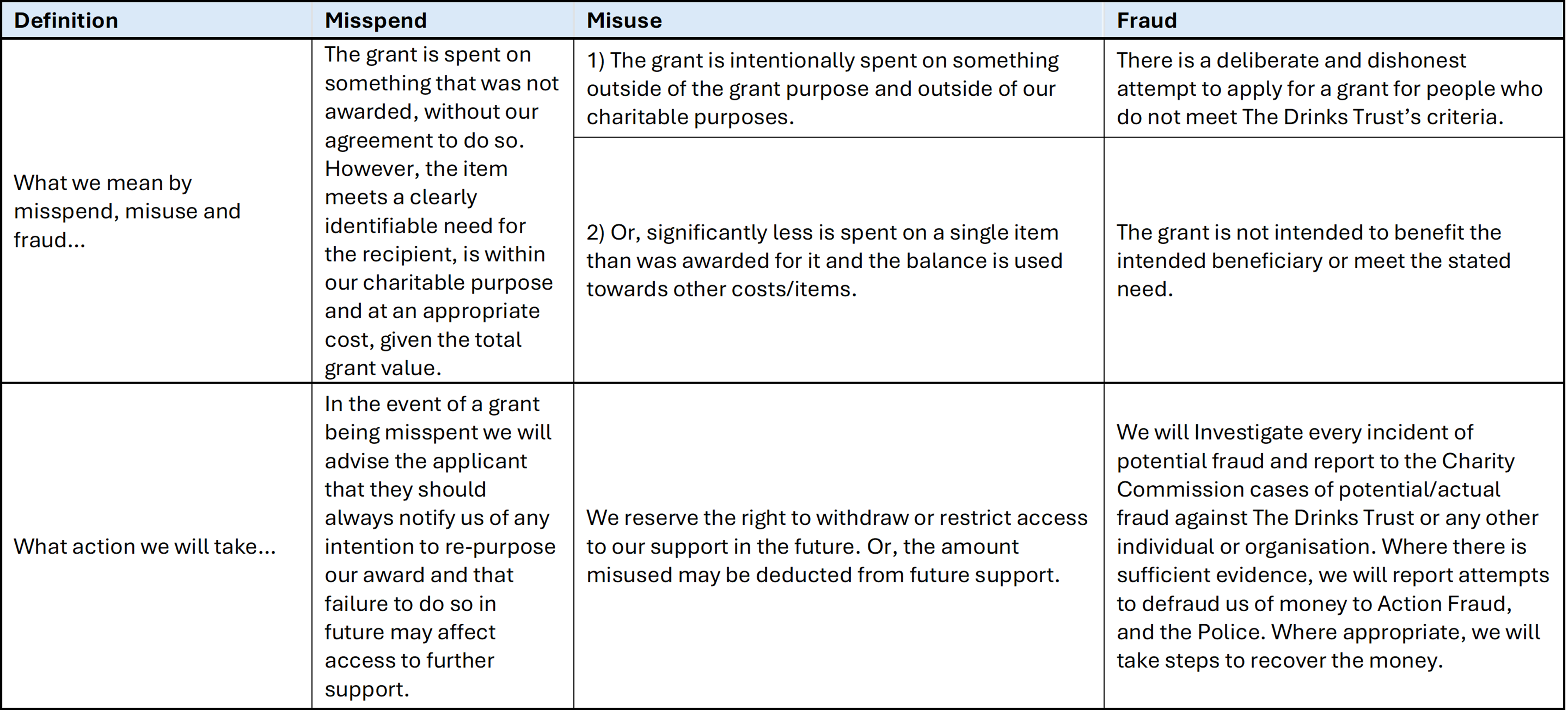 Individuals can be prosecuted under the Fraud Act 2006 if they make a false representation, fail to disclose information or abuse their position. However, we understand that there are circumstances where funds are mispent or misused, but that do not necessarily meet this definition of fraud. Below is a description of how we differentiate these and the resulting differences in our response.